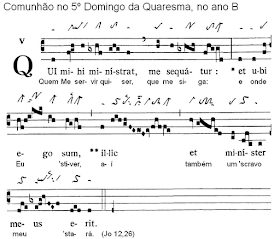 Comunhão Qui mihi ministrat, que se canta quando fôr lido outro Evangelho que não o de Lázaro ou da mulher adúltera. Aqui na versão portuguesa Quem Me servir quiser (MP3):